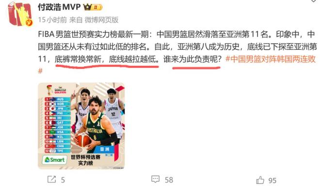 日前,FIBA官方更新了世界杯亚洲区预选赛最新一期实力榜,中国男篮暴跌8名,排在第11,对此媒体人付政浩发文表示:“印象中中国男篮还从未有过如此低的排名,自此亚洲第八成为历史,底线已经下探至亚洲第11,底裤常换常新,底线越拉越低,谁来为此负责呢?