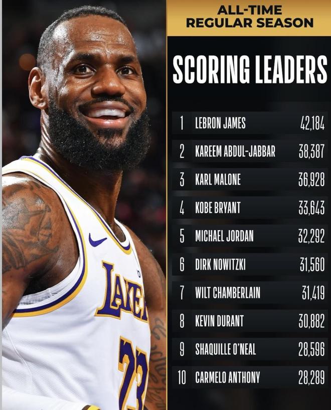 另一边,詹姆斯已经把历史得分纪录推到42184分,杜兰特、威斯布鲁克等现役球星同样还在榜单上持续累加。 下面这份榜单会把历史前20位常规赛总得分一一列出来,所有数据统计截至2025年11月18日。