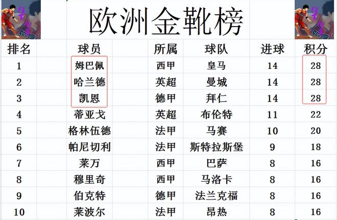 欧洲金靴榜最新战报 姆巴佩凯恩哈兰德第1 意甲无人进前十